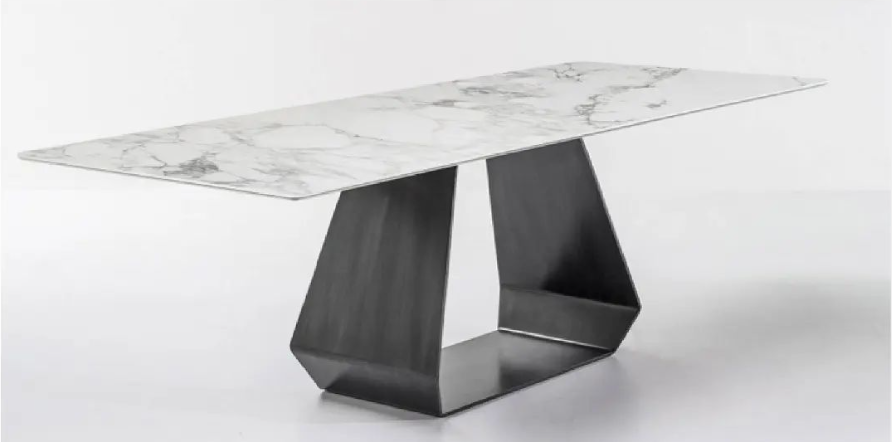 A contemporary dining table featuring a sintered marble top elegantly contrasted by sleek stainless-steel legs. The sintered surface offers durability and luxurious aesthetics, while the stainless-steel base adds a modern touch and stability. Ideal for chic dining spaces, this fusion of materials creates a sophisticated focal point for gatherings and meals.